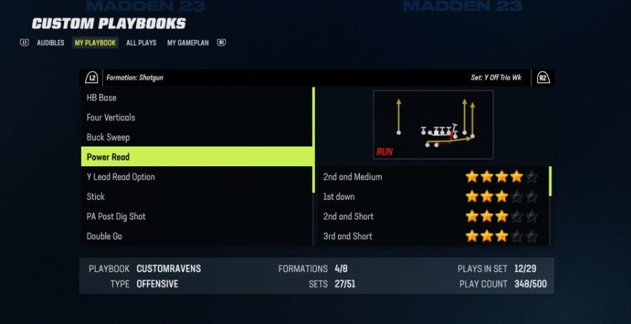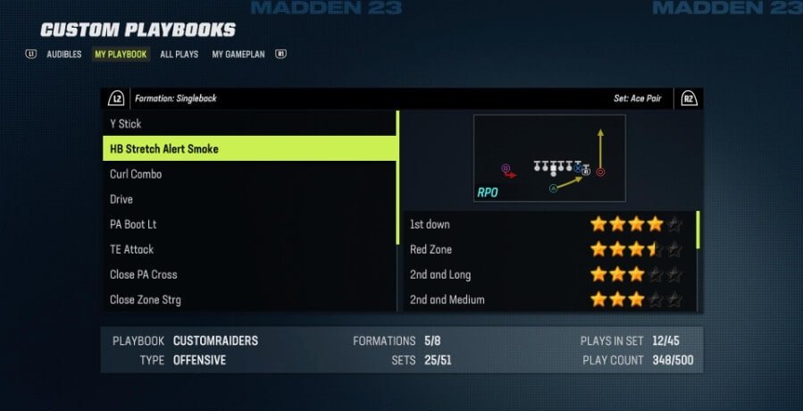 ベストプレイ: スティック N ノッド (ショットガン エンプティ HB ワイド)、スピード オプション (ピストル ウィング フレックス クローズ)、PA ブーツ (シングルバック バンチ)
