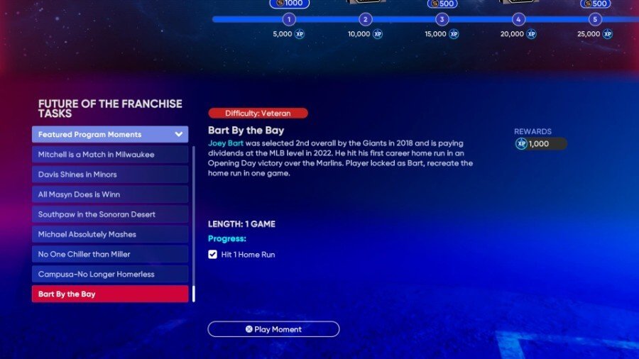 チョイスパックの各カードには、完了すると、 追加の1000の経験を追加します プログラムに。 これは、それらのプレーヤーとゲームをプレイすることで得られる経験に追加されます。 内訳は簡単です: 投手は500の並行経験が必要ですが、打者は300が必要です。 ヒント:打者よりも投手との並行経験を積み上げる方が簡単なので、最初に投手をターゲットにします。