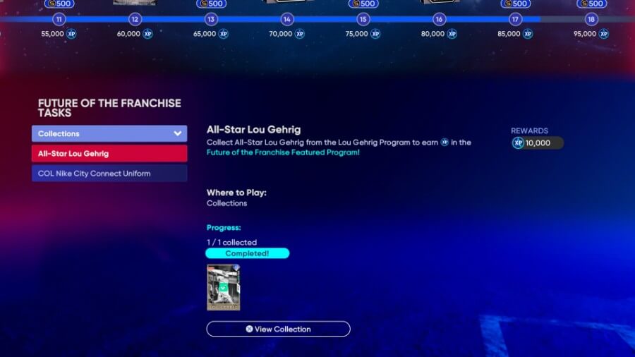 プログラムを開始するための2つのコレクションがあります。 まず、 ルーゲーリッグデイプログラムのオールスタールーゲーリッグ (他のプログラムにあります)。 それはプログラムに1万の経験を追加します。 ルーゲーリッグデーのミッションを完了して、カードのロックを解除します。
