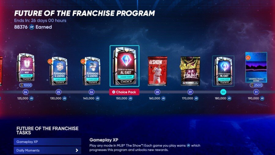 前述のように、 チームごとに1枚のフランチャイズカードの未来、合計30。 あなたはできるでしょう プログラムを通じて30のうち12のロックを解除します。 あなたは15万の経験であなたの最初のロックを解除します–レベル27 –そして 3万回の経験の後、その後2万回の経験ごとに新しいパックのロックを解除します 部門ごとに2つのパックを収集するまで。