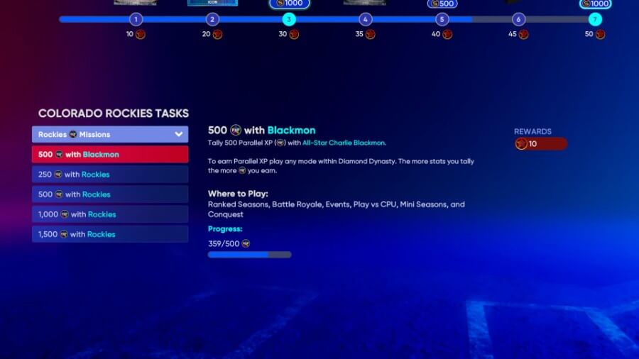 そこから、ミッションを実行します。 これらは単にあなたを持っています コロラドのプレーヤーと並行して経験を積む。 コロラドの打者だけをラインナップし、コロラドのピッチャーだけを使用する場合は、結果に応じて、1回のコンクエストゲームで250(2つのプログラムスター)と500の経験(3つのプログラムスター)のミッションを達成する必要があります。 これにより、ブラックモンのロックが解除され、コロラドプレーヤーとして、彼は自分で作業しながらミッションを支援できます。