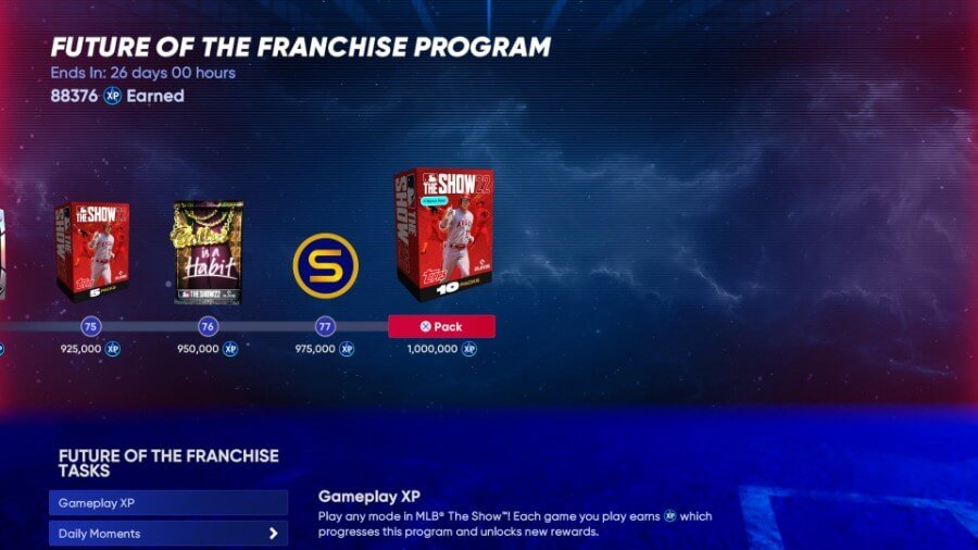 フランチャイズの未来は、レベルと経験の上限の点でこれまでで最大のプログラムです。 40レベルと50万の経験しかなかった以前のHalladayandFriendsプログラムとは異なり、Future oftheFranchiseにはなんと素晴らしいものがあります 78レベルと100万の経験値キャップ。 これにより、これらの無料パックをすべて手に入れることができます。 することを忘れないでください 毎日簡単に千の経験のための毎日の瞬間。
