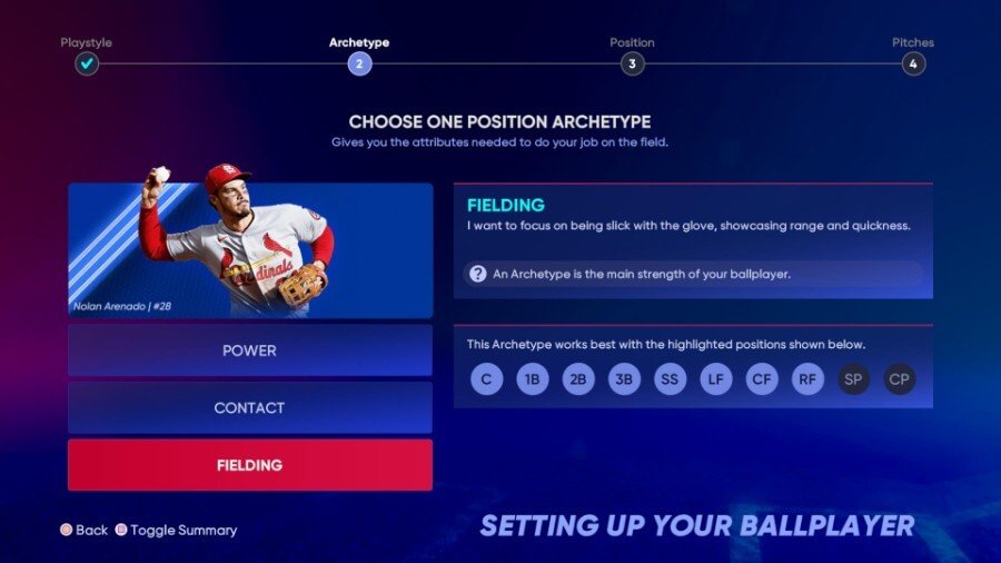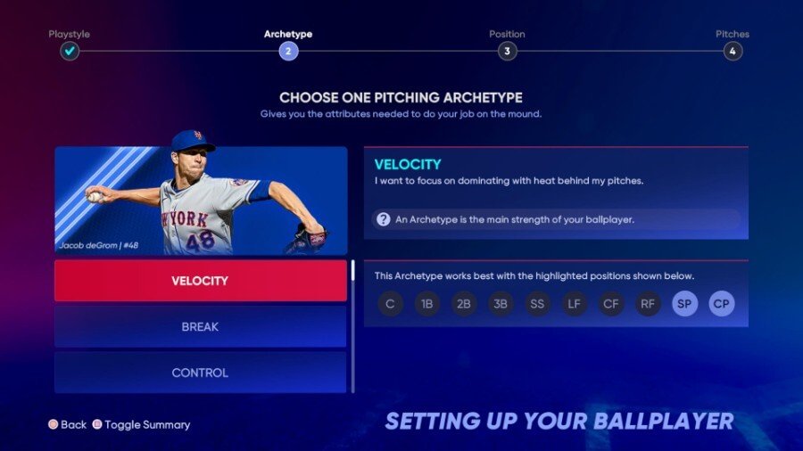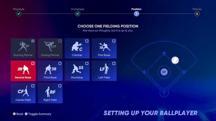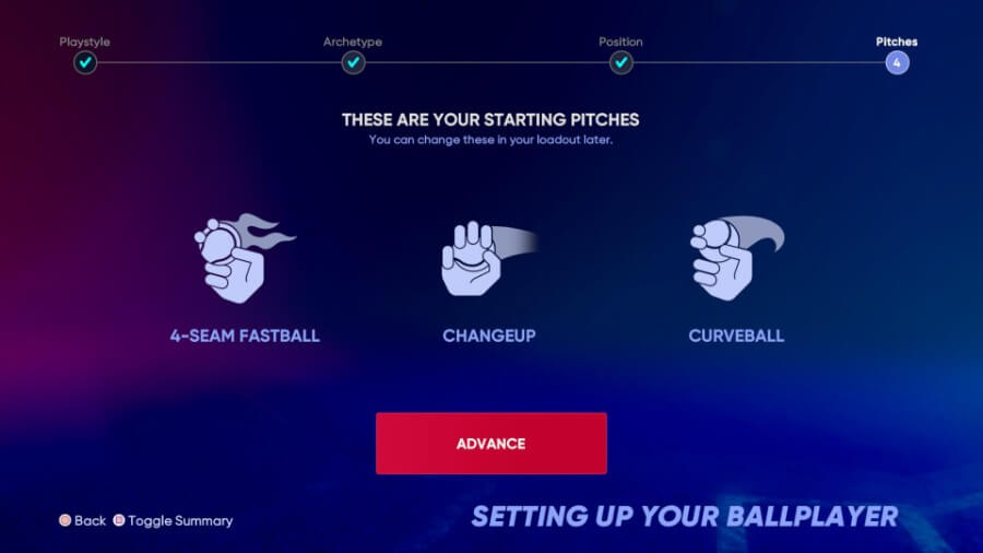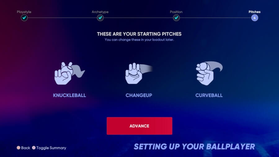 ピッチャーの場合、リリーフまたはクローザーになりたい場合は、クロージングピッチャーを選択します。 それ以外の場合は、スターターを選択します。 アーキタイプに応じて、開始するために常に3つのピッチが与えられます:4シームの速球、チェンジアップ、およびカーブボール また ナックルボール、チェンジアップ、カーブボール。