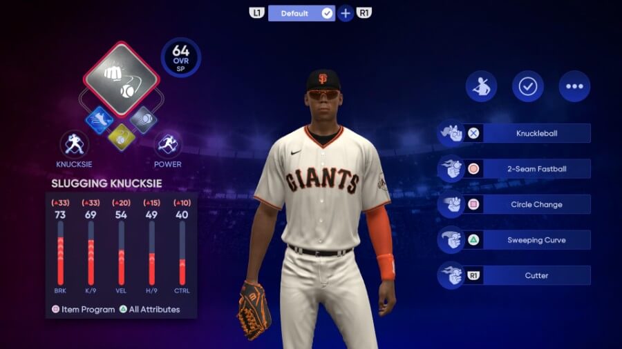 幸いなことに、ピッチを追加または変更できるのはトレーニングによってのみであるショーの以前のエディションとは異なり、 ロードアウト画面からすぐにレパートリーを変更できます。 ページの右側に移動して、各ピッチを選択するだけです。 そこから、ゲーム内のすべてのピッチから選択できます。 ナックルボールの原型でない場合でも、ナックルボールを追加することはできますが、ナックルボールの場合ほど効果的ではありません。