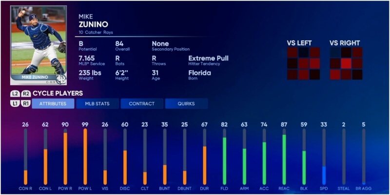 彼はスピードが平均をはるかに下回っていますが、腕の強さとスローの精度で平均以上の評価でそれを補っています。 ズニーノの総合評価は84で、MLB The Show 22で最高のキャッチャーの1人になりました。彼は2021年のシーズンを、33本塁打、62打点、平均打率.216で終えました。