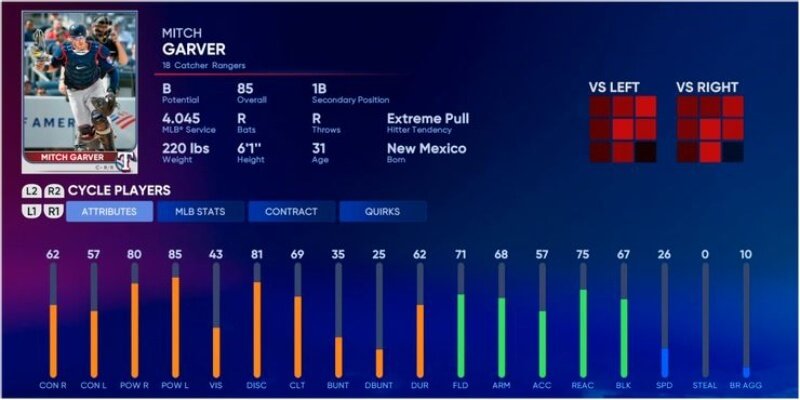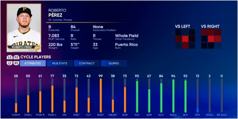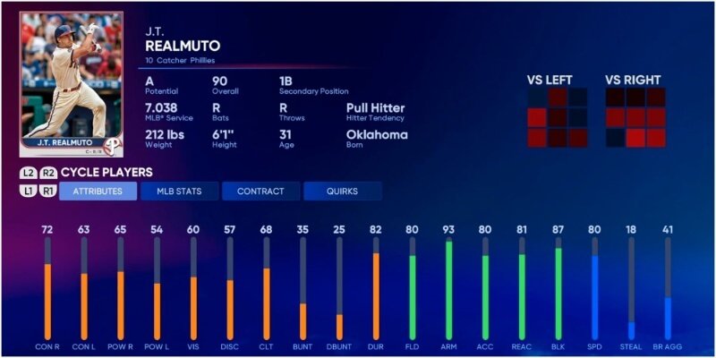 リアルミュートは、ボールの両側でうまくプレーする、バランスの取れたタイプのキャッチャーですが、彼のフィールドは彼が最も価値を追加する場所です。 パワーヒットに関して言えば、彼は平均をわずかに上回っており、右利きの人に対しては65のパワーレーティング、左利きの人に対しては54のパワーレーティングを持っています。 彼は、右利きのピッチャーに対して72の接触属性、左利きのピッチャーに対して63の接触評価でボールに接触するのが得意です。 Realmutoをキャッチャーとして間違えることはできません。 2021年のシーズン中、彼は17本塁打、73打点を記録し、打率は.263でした。