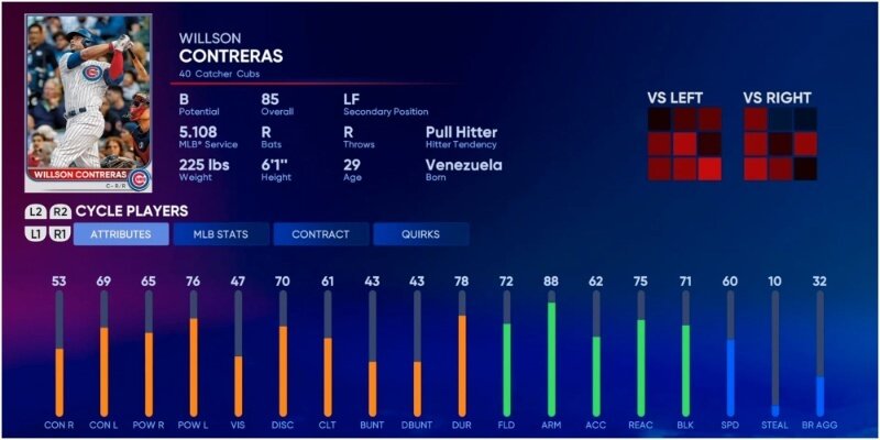 ウィルソン・コントレラスは、全面的に高い評価を得ています。 彼の88の腕の強さは彼の最大の特徴です。 腕の強さが大きいキャッチャーは、盗塁を選択するランナーと戦うのに非常に役立ちます。 彼は全体的に72の守備能力を持ち、78の耐久性評価を備えているため、信頼できる防御プレーヤーになります。 全体として、彼はプレーヤーとして85と評価しています。