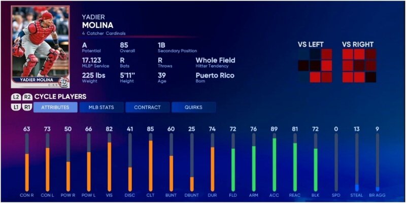 モリーナは、72歳の守備能力で、平均をわずかに上回っています。 彼は印象的な89のスロー精度評価と81のリアクションタイムを誇るので、ランナーはプレートの後ろで彼に注意する必要があります。 全体的に、彼は防御属性の5つのカテゴリーでかなり堅実であり、72のプレートブロッキング能力が75未満の唯一の属性です。モリーナの総合評価は85です。2021シーズン、モリーナは11本塁打を放ち、66打点と1打点を記録しました。 252打点平均。
