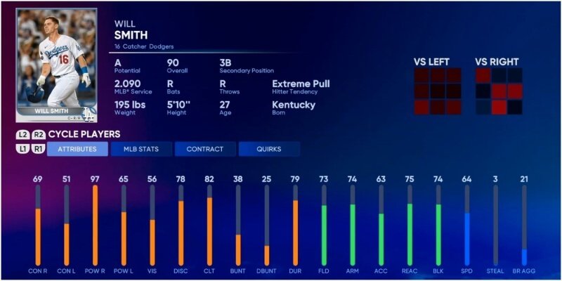 ウィル・スミスは、すべてをかなりうまく行うことができ、それらの多くのことを非常にうまく行うキャッチャーです。 彼は驚異的な97のパワーレーティングと右利きのピッチャーを持っており、82のバッティングクラッチレーティングと非常によく対になっています。 彼は79の耐久性評価と78のプレート規律属性評価を持っています。 彼は間違いなく堅実な毎日のキャッチャーです。