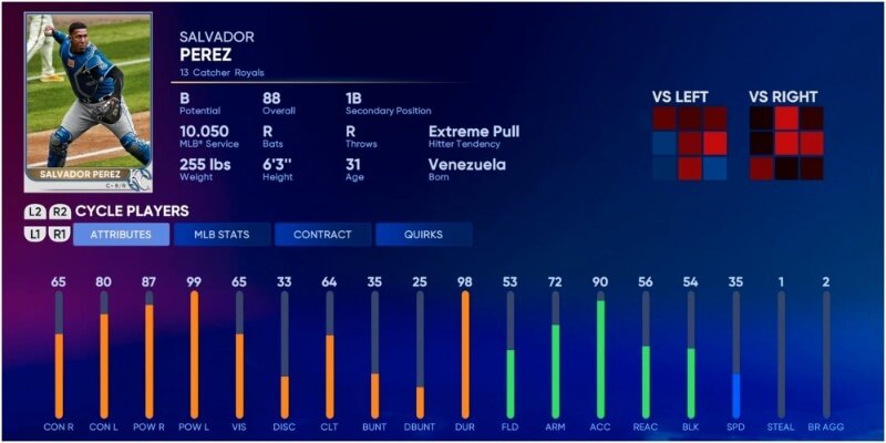 サルバドールペレスの弱点は弱点でさえありません。 彼がホオジロが得意でないかどうかは誰が気にしますか。 彼はそれを公園からノックアウトすることを好み、それで非常に成功しています。 ペレスはカンザスシティの最高の選手であり、リーグのトップ5のキャッチャーでもあります。 彼は左利きのピッチャーに対して99のパワーレーティングで最大になり、右利きのピッチャーに対して87のパワーレーティングを達成します。 彼は左利きと右利きの両方に対して接触打者としてかなり高いスコアを出します。 この男は確かにプレートで致命的です。