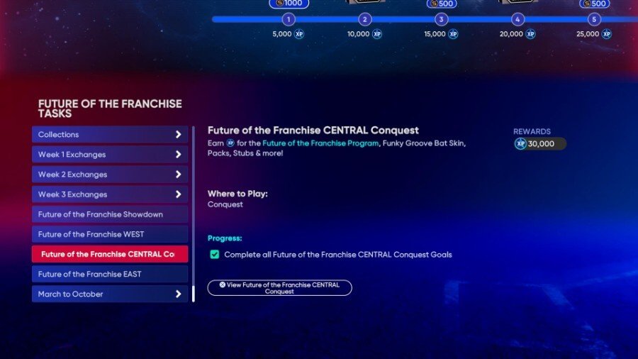それらを完了すると、メインプログラムにXPの大きなチャンクも追加されるため、それらをターゲットにします。 たとえば、写真のフランチャイズセントラルコンクエストマップの未来 3万経験値を追加。 一般的に、これらのマップと対決はネットになります 15〜3万の経験 完了したら。 ほとんどのプログラムには2つのコンクエストマップと1つのショーダウンがありますが、現在のプログラムの長さとテーマでは3つのコンクエストマップがあり、今後さらに増える可能性があります。