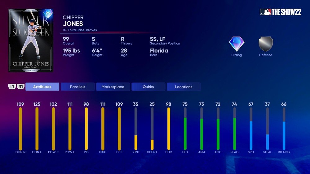次は 賞 チッパー・ジョーンズ(三塁) 2000 年のシルバースラッガーの優勝シーズンから。ジョーンズは、MLB の歴史の中で (マントルのように) 数少ないパワーヒッターのスイッチヒッターの 1 人であり、遊撃手と左翼手もプレーします。 彼の打撃能力は文字通り表に出ません: 109 コンタクト ライト、125 コンタクト レフト、102 パワー ライト、111 パワー レフト、111 プレート ディシプリン、109 バッティング クラッチ。 彼はまた、98 プレート ビジョンと 98 耐久性を持っています。 彼の防御力は平均以上で、目を見張るものではありませんが、スピードと同様に十分です。