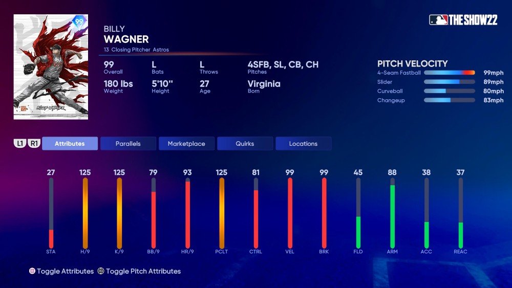 最初のボスは 岡崎貴 ビリー・ワグナー(クローザー). 元ヒューストンとフィラデルフィアの偉人は、彼のヒューストン バージョンです。 彼は、9イニングあたりのヒット数が125、9イニングあたりのストライクアウト、およびピッチングクラッチで、ほぼ無安打です。 彼のベロシティとピッチブレイクは両方とも 99 であり、彼の唯一の本当の弱点はピッチング コントロール (81) と相関する 9 イニングあたりのウォーク数 (79) です。 それでも、彼は4ピッチのレパートリーを詰め込んでおり、これはリリーフ選手にはまだ珍しい.