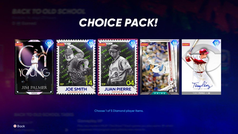 レベル 13 (経験値 35,000) になると、 3 つのフラッシュバック & レジェンド チョイス パックのうちの最初のものをアンロックする. チョイスパックの中身は Jim Palmer (95 OVR)、Finest Joe Smith (95 OVR)、Juan Pierre (97 OVR)、Prime Justin Turner (96 OVR)、Signature Tony Perez (95 OVR) を受賞。