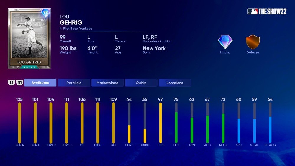 最後は プライム ルー ゲーリック (一塁手). ヤンキーの伝説は、ジョーンズのように攻撃がすべてです。 99未満の彼の唯一の非バンティング属性は、97の耐久性であり、一塁ではあまり問題になりません. 彼は 125 コンタクト ライト、101 コンタクト レフト、104 パワー ライト、111 パワー レフト、106 プレート ビジョン、111 プレート ディシプリン、109 バッティング クラッチを持っています。 彼はジョーンズよりもわずかに防御力とスピードが劣っています。