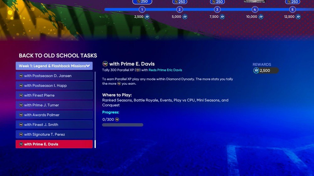つまり、10 の 6つとそれぞれのプログラムミッションのロックを解除します. 打者の場合は、 300 パラレル経験値を獲得して 2,500 経験値を獲得. 投手(パーマーとスミス)の場合、 パラレル経験値500獲得. パラレル経験をより早く得ることができるので、通常はピッチャーをターゲットにすることをお勧めします。 ただし、この段階では、 レジェンドとフラッシュバックのコレクションを完成させる.