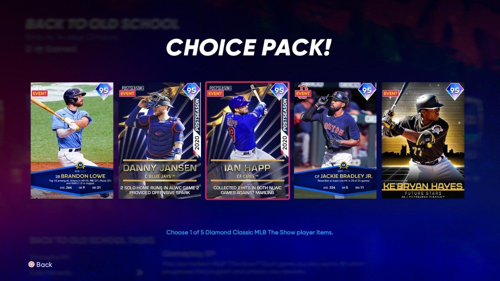 レベル 10 (経験値 25,000) では、 3 つのクラシック チョイス パックのうちの最初のものをアンロックする. チョイスパックの中身は マンスリー アワード Brandon Lowe (95 OVR) と Jackie Bradley, Jr. (95 OVR)、Postseason Danny Jansen (95 OVR) と Ian Happ (95 OVR)、 未来のスター Ke’Bryan Hayes (95 OVR). 数少ないパックの一つです ピッチャーなし .
