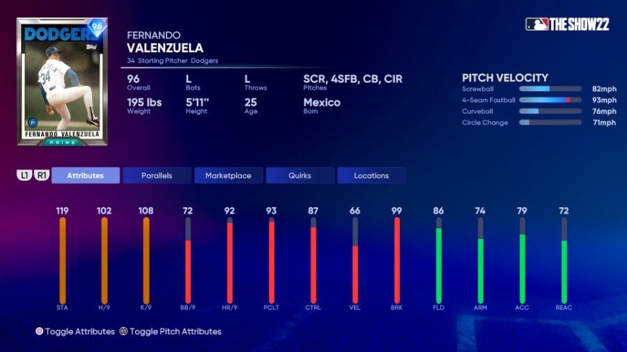 あなたがヒットした場合にもあなたは素晴らしい驚きを受け取るでしょう プライムフェルナンドバレンズエラの形で30万の経験。 公式の「ボス」ではありませんが、バレンズエラは、ローテーションのトップを指揮できる別の96 OVRカードとして、またはバトルロワイヤルやランクシーズンでスターターを獲得した場合はローテーションのバックエンドとして、ボスを効果的に模倣します。 ヴァレンズエラは9イニングあたり119のスタミナと108の三振を持っています彼はヒット(102)とホームラン(92)を制限しますが、いくつかの打者(72)を歩くかもしれません。 彼の高いピッチコントロール(87)を考えると、これは少し奇妙ですが、99ピッチブレイクもあります。 彼は、彼の(不)有名なスクリューボール、4シーマー、カーブボール、サークルチェンジを含む4ピッチのレパートリーを持っています。