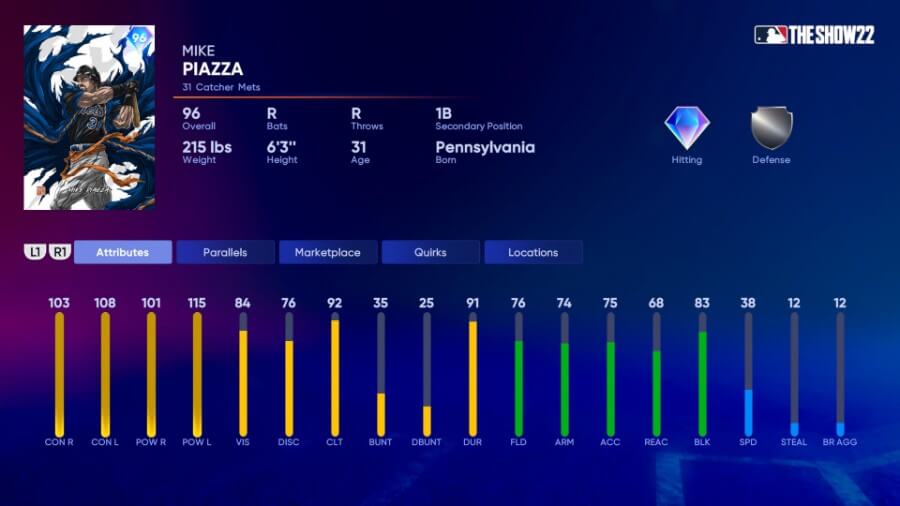 次は–少なくともこのバージョン–元メッツの偉大なマイクピアッツァ、間違いなくMLB史上最高の攻撃的なキャッチャーです。 そのタイトルは、彼の文字通りのオフザチャートの打撃スキルにも当てはまります。 彼はコンタクトRとコンタクトLに103と108を持ち、パワーRとパワーLに101と115を持っています。彼はスライバーレーティングの堅実で見事ではない防御的なキャッチャーですが、重要なことに、彼は優れた耐久性を持っています(91)。 彼は一塁もプレーできます。