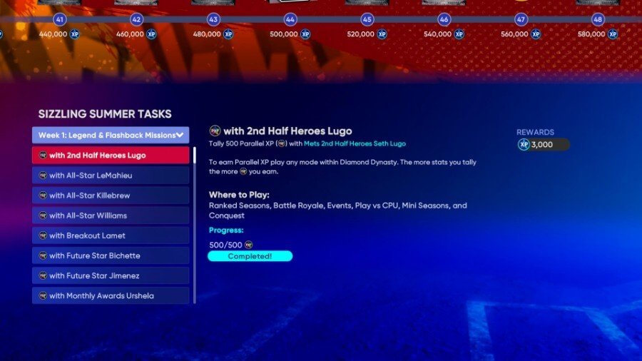 これらの各カードには、並行体験ミッションが付属しています 完了すると3,000の経験値が追加されます。 ミッションは簡単に分類されます。 投手は500人、野手は300人の並行経験が必要です。 ピッチャーのパラレルエクスペリエンスを構築する方が簡単なので、ピッチャーをターゲットにすることをお勧めします(特にタスクをターゲットにしている場合)。 500のパラレル経験は、ピッチャーをパラレルレベル1(緑)にブーストするので、ピッチャーでそれを打ったことがわかります。 たとえば、コンクエストゲームで9回の三振で3イニングの完封(もちろん勝利を奪う)を投げ、下にプレイできるマップがある場合、500の並行経験を達成する必要があります たった2回の3イニングゲームで。