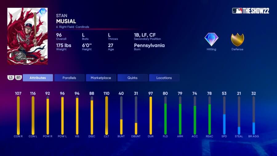 最後になりましたが、間違いなく重要なのは、セントルイスのアイコンであるスタン「ザマン」ミュージアルです。 主な右翼手であるミュージアルは危険な打者であり、それが彼が殿堂入りを果たした方法です。 ミュージアルは、ワーグナーのように、コンタクトR(107)とコンタクトL(116)の評価が高いですが、92パワーRと96パワーライトではるかに強力です。 彼はまた、110のバッティングクラッチ、97の耐久性、94のプレートビジョン、88のプレートディシプリンを備えており、バットのあらゆる面で脅威となっています。 彼は金の評価を受けた防御力とまともなスピードを持っています(53)。 彼は他の外野手と一塁手でプレーすることができますが、トップエンドのスピードと優れた防御力がないため、中堅手でプレーしないことをお勧めします。