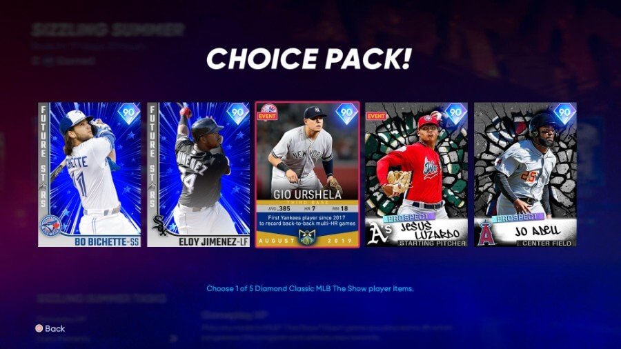次に、ロックを解除します クラシックパック(写真)30,000回の体験。 繰り返しになりますが、これらはすべて90 OVRであり、Future Stars Bo Bichette、Future Stars EloyJiménez、Monthly Awards Gio Urshela、ProspectJesúsLuzardo、ProspectJoAdellが含まれます。 ロックを解除できるようになります 各パックのうち3つは、120,000の経験を達成する必要があります。 ただし、それは、マーケットプレイスで購入しない限り、2枚のカードを残しておくことを意味します。