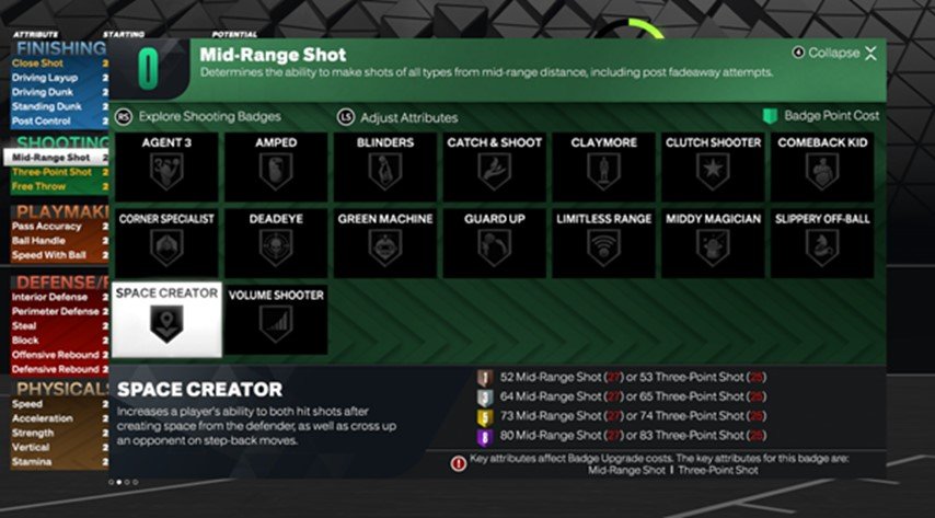 Space Creator バッジを使用すると、最初からその利点を得ることができます。 それがドリブラーとディフェンダーの間に小さな隙間を作るのです。 プレイメイキング バッジ Ankle Breaker のシューティング バージョンと考えてください。