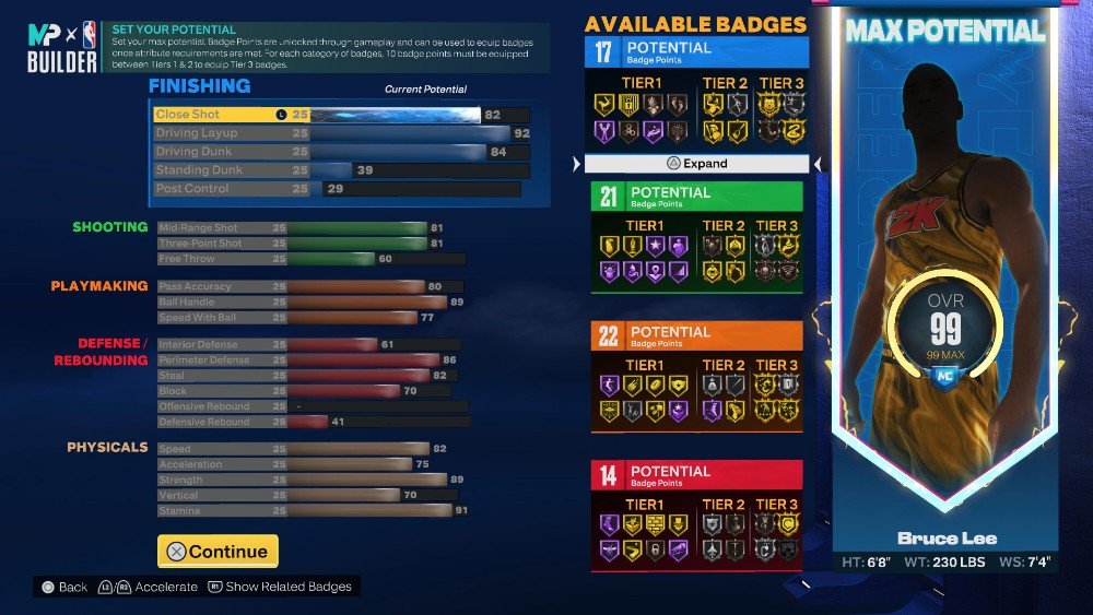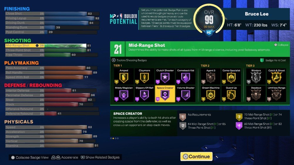 仕上げとよく発達した射撃兵器を組み合わせると、攻撃で止められなくなります。 潜在的なバッジ ポイントは 21 で、殿堂バッジ 5 つ、ゴールド バッジ 6 つ、シルバー バッジ 1 つ、ブロンズ バッジ 3 つにアクセスできます。 ハイレベルなスコアラーになるためには、コートのどこからでもシュートを放つことが不可欠であるため、このビルドは 81 ミッドレンジ シュートと 81 スリーポイント シュートを提供し、完全なパッケージを提供します。 スモール フォワード ポジションでのより重要なスキルの 1 つは、中距離での難しいショットを作ることです。そのため、ミディ マジシャンとガード アップが価値があります。 また、Limitless Range や Deadeye などの Tier 3 バッジを使用すると、長距離射撃能力に事欠きません (Tier 3 バッジ 4 つの属性グループすべてのロックを解除するには、ティア 1 と 2 の間に 10 個のバッジ ポイントが必要です)。
