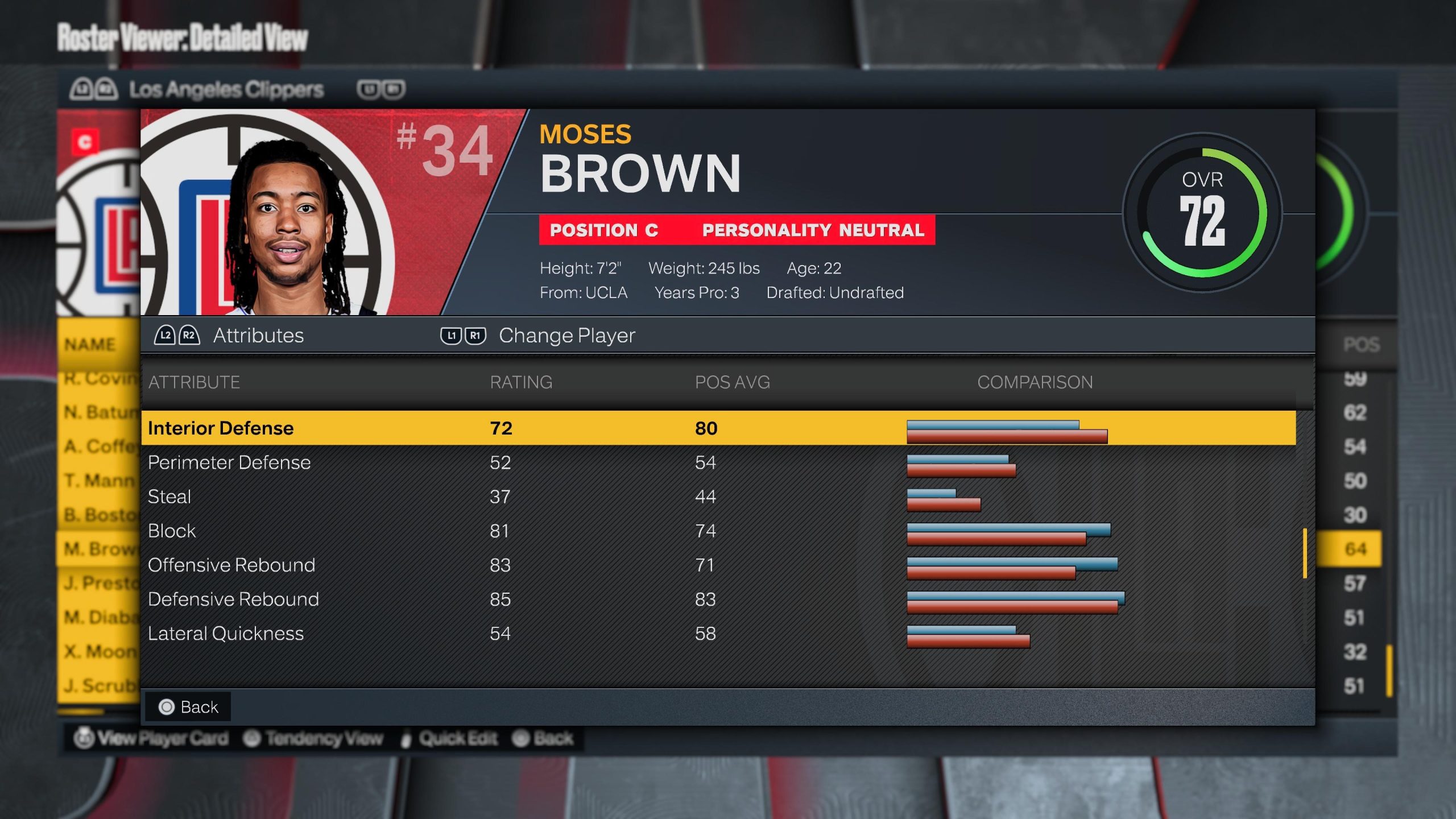 ブラウンは 85 のディフェンシブリバウンドと 81 のブロックを持っているため、攻撃的なプレーヤーにとっては問題です。 攻撃では、この若いセンターは 83 のオフェンシブリバウンドと 75 のスタミナで、ペースの速いゲームに追いつくことができます。