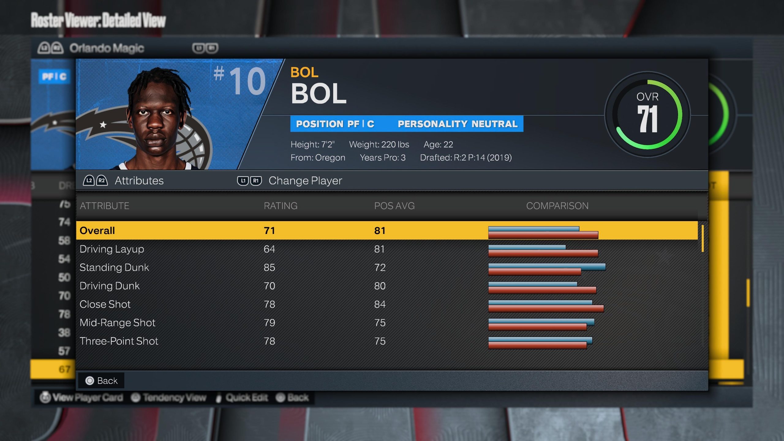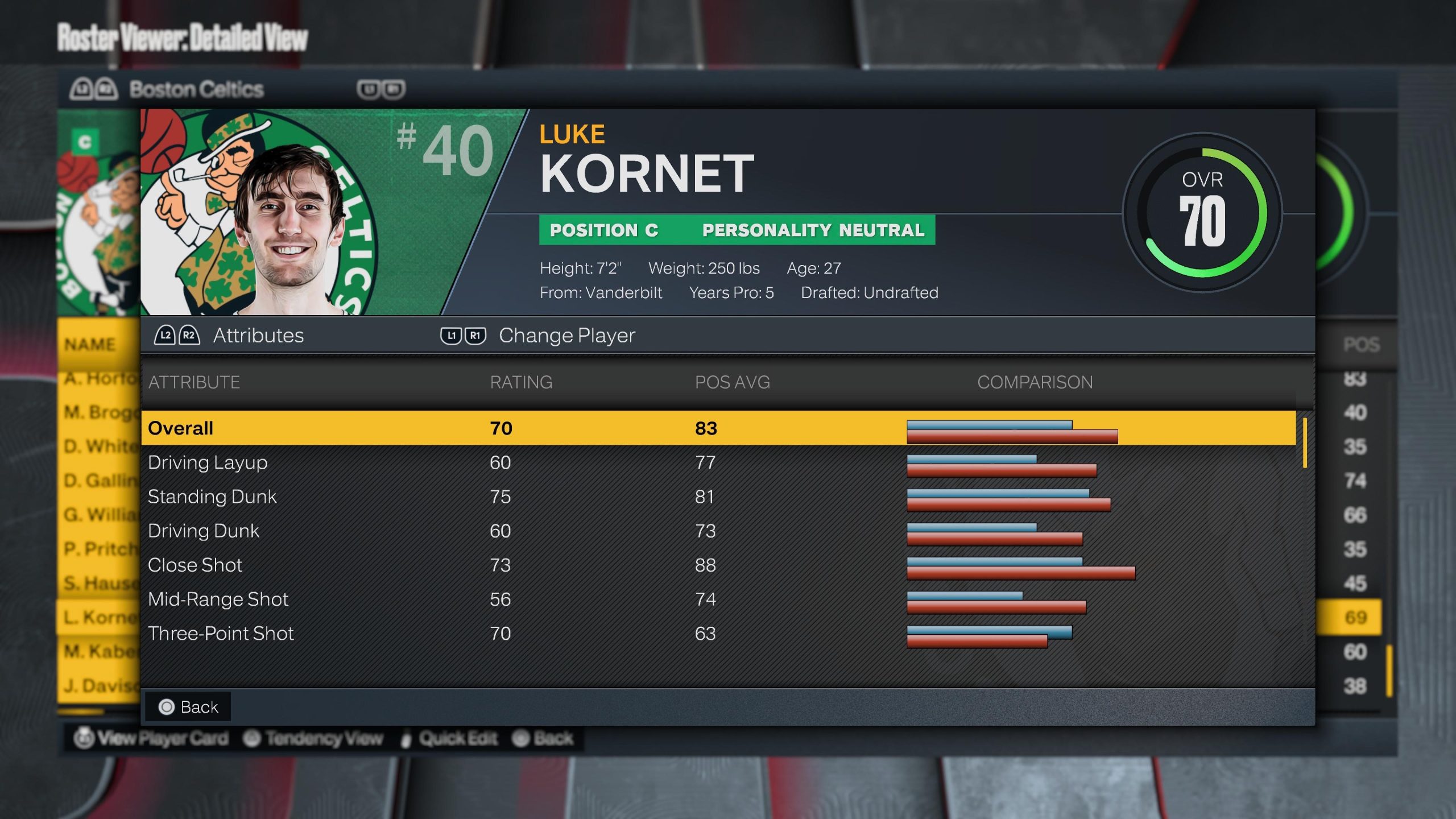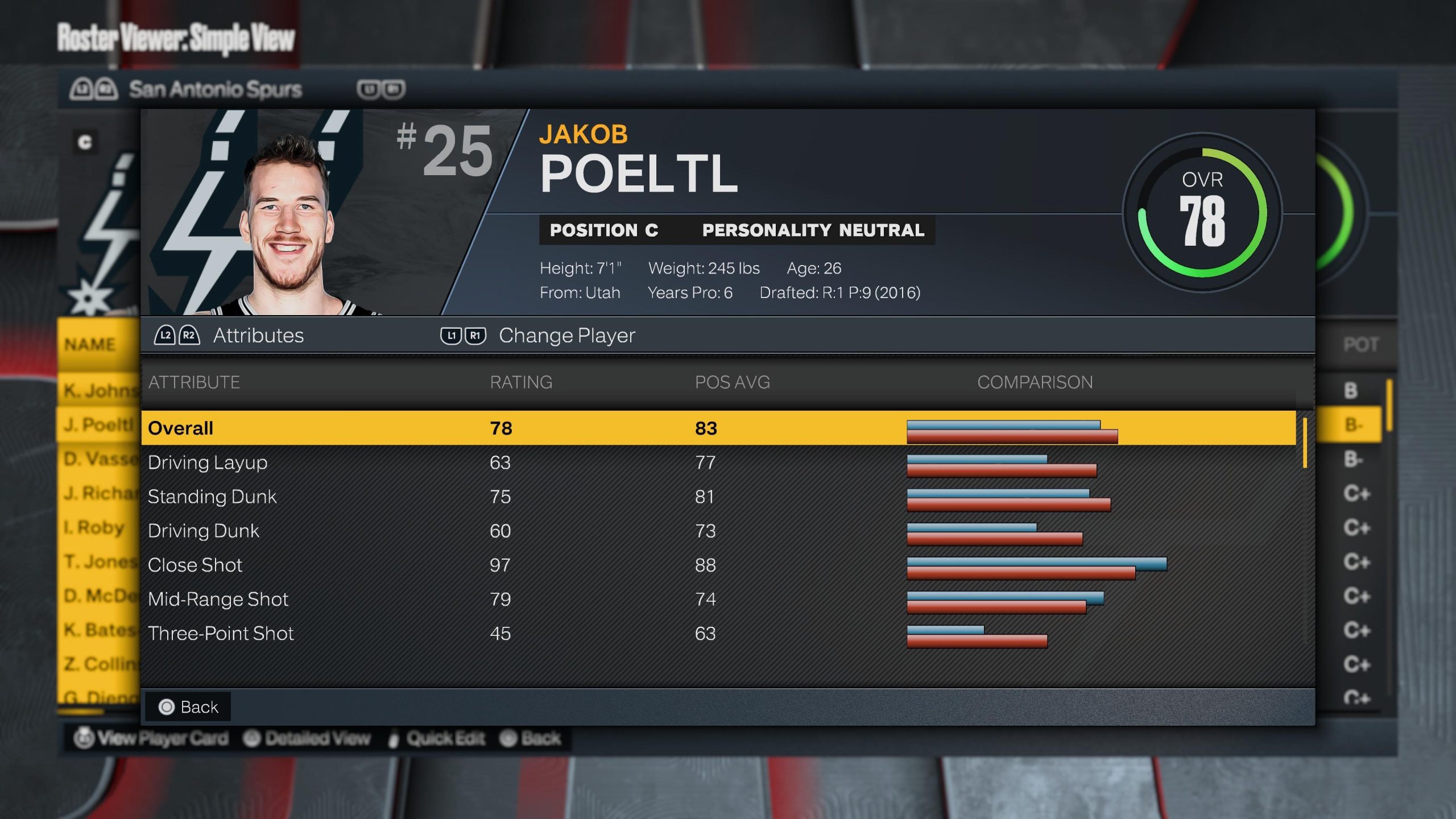 ポートルは、97 のクローズ ショット、79 のミッドレンジ ショット、89 のオフェンシブ リバウンドを備えたオフェンスで危険であり、理想的なピック アンド ロールまたはミッドレンジ ピック アンド ポップ パートナーとなっています。 オーストリア人は、81 の内部防御と 85 のブロックで防御にも貢献できます。