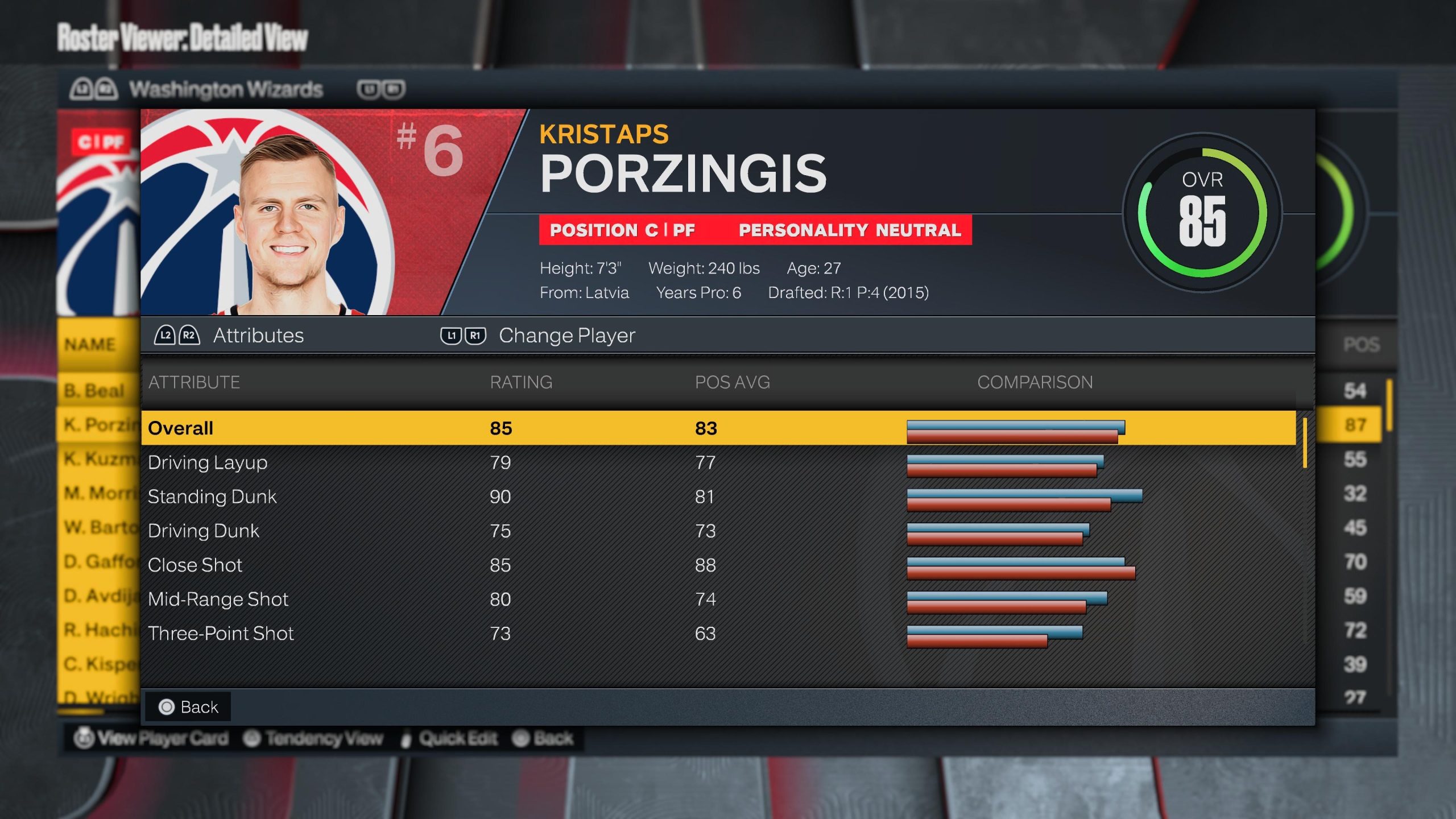 Porziņģis は、80 のミッドレンジ シュートと 73 のスリーポイント シュートを備えた、このような背の高いプレーヤーにとって印象的なシューターです。 彼はまた、88 ポスト フェードを使用してポストで危険になることもあります。 ラトビア人は、85 ブロックと 83 ディフェンシブ リバウンドを備えた防御の岩でもあります。
