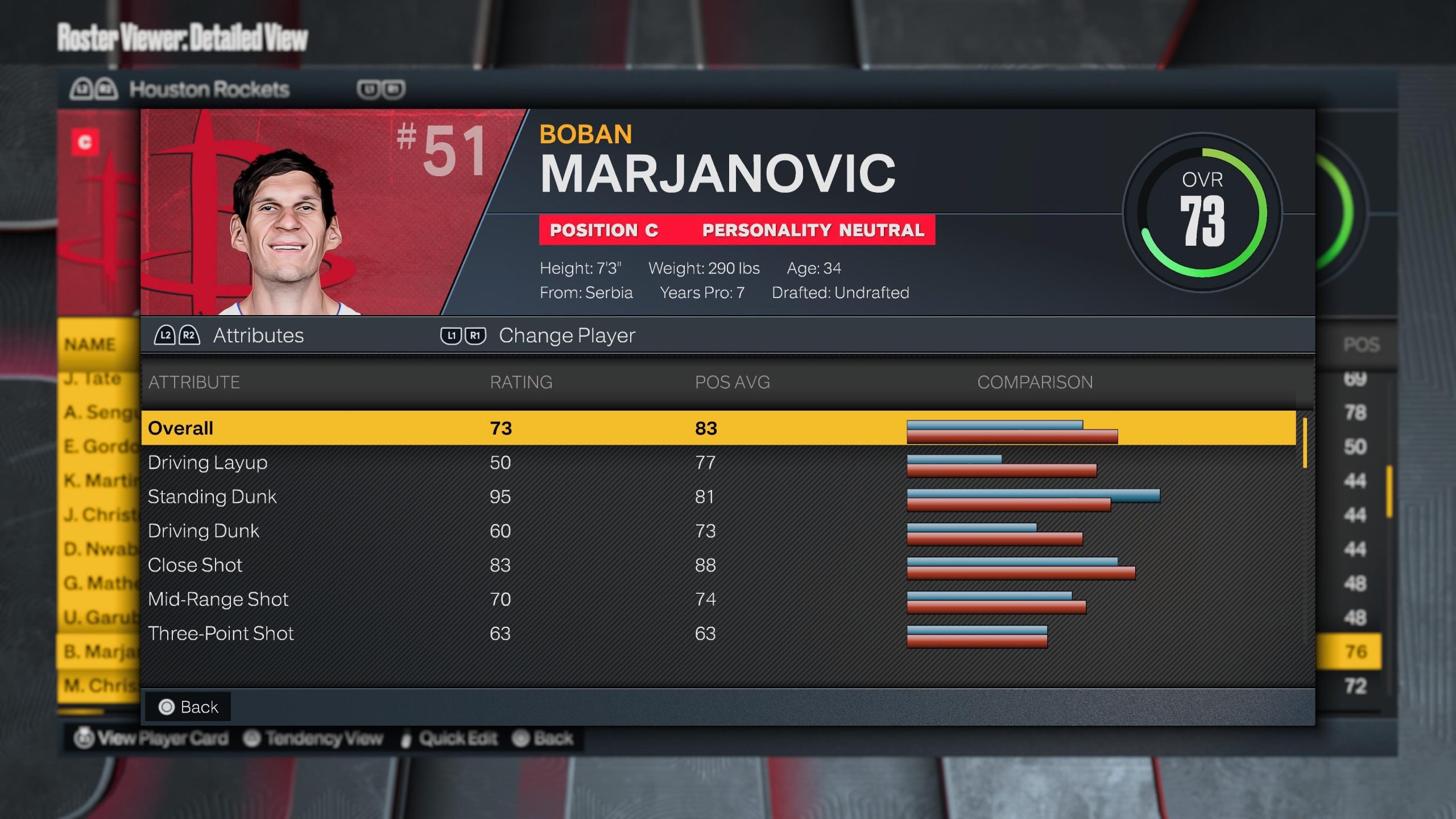 マルヤノビッチは、スタンディング ダンク 95 とクローズ ショット 83 を誇るインテリア フィニッシャーです。 34 歳の彼は、88 のディフェンシブ リバウンドと 73 のインテリア ディフェンスを備えているため、ディフェンスでも前かがみになることはなく、コートの両端で優れた成績を収めています。