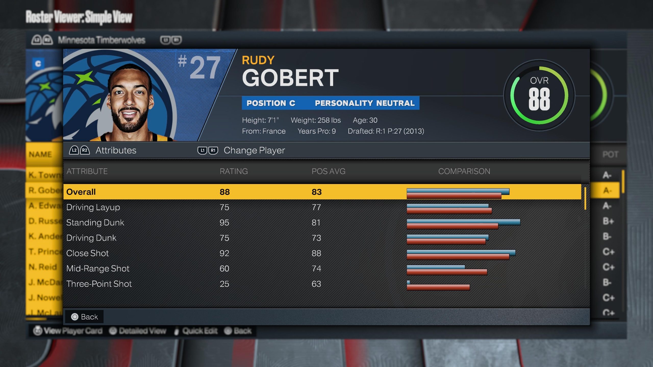 98 の防御リバウンドと 87 の内部防御を備えたゴベールは、攻撃的なプレーヤーにとって悪夢です。 彼の防御力に加えて、彼の攻撃は 92 のクローズ ショットと 95 のスタンディング ダンクで彼をよく引き立てます。 彼はピック アンド ロールと、オフェンシブ リバウンド後のイージー プットバックをつかむのに最適です。