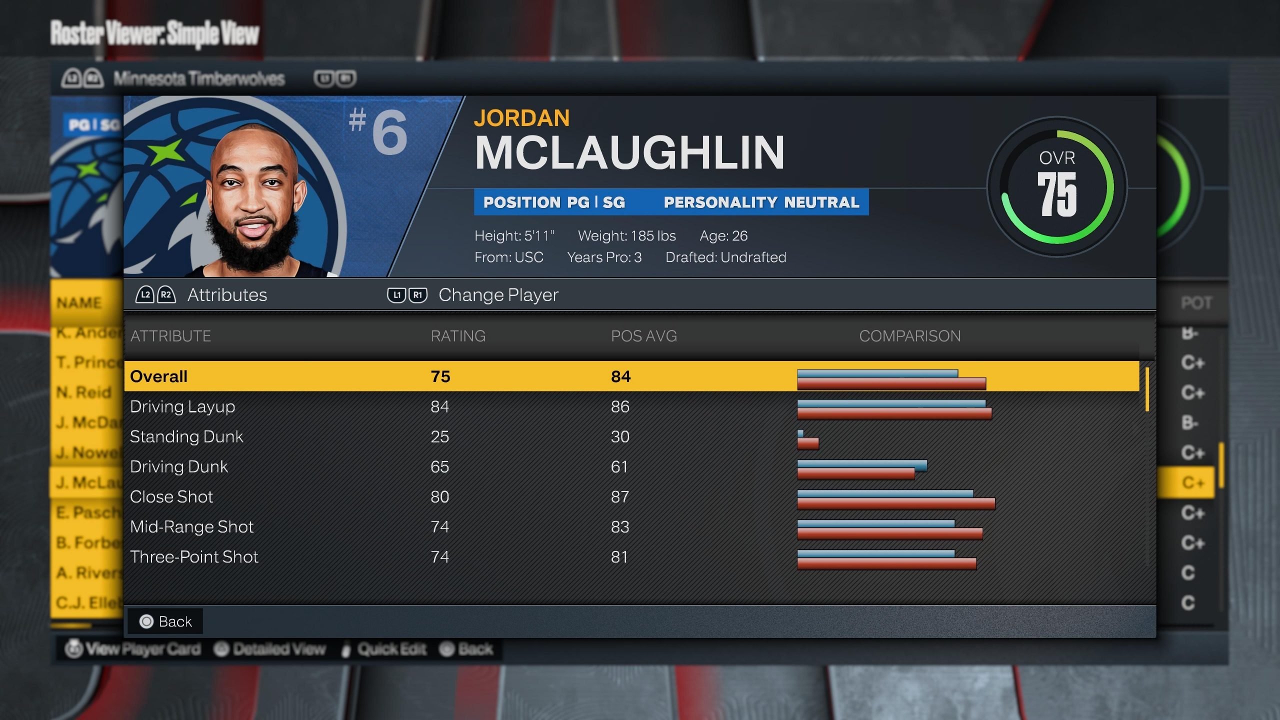 26 歳の彼は、84 のドライビング レイアップ、80 のクローズ ショット、74 のミッドレンジ ショット、74 のスリーポイント ショットという優れたオフェンシブ スタッツを備えており、比較的優れたシューターになっています。 McLaughlin は 84 ボール ハンドルも持っています。これは彼と彼のチームメイトのためにスペースを作るのに役立ちます。McLaughlin は 89 スティールも持っており、彼の側にボールを取り戻すことができます。