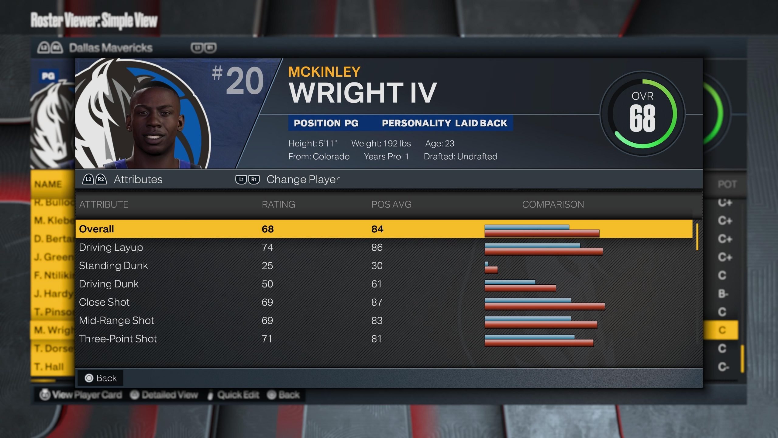 ライトは、74 回のドライビング レイアップ、71 回のスリーポイント シュート、84 回のフリー スローで、かなりの攻撃統計を持っています。 彼の特筆すべき能力は、スピード 84、アクセラレーション 84、ボールを持った時のスピード 84 であり、どんなディフェンダーも追い抜くことができます。 ただし、ローテーションをクラックする可能性は低く、OVR が 68 と評価されているため、ガベージ タイムの分しか表示されません。