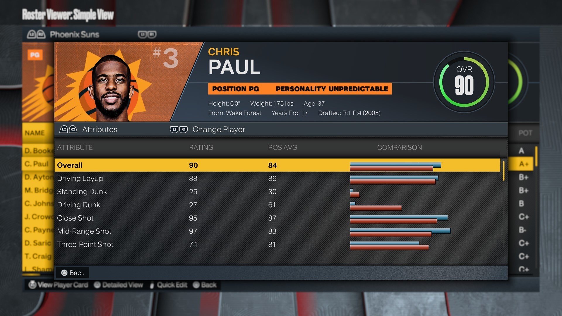 ポールは、ベテラン プレーヤーとしては信じられないほどの統計を持っています。彼は、フェニックスに進出して以来、新しいレベルに到達しているようです。 攻撃的には、彼の 97 ミッドレンジ ショットと 95 クローズ ショットにより、彼は史上最高のミッドレンジ シューターの 1 人となっています。 彼のスリーポイント シュート (74) は以前ほどではありませんが、アークの向こう側からはまだ平均を上回っています。 彼は88回のドライビングレイアップも持っているので、バスケットの周りでフィニッシュすることも問題ありません. 彼はパスで有名で、96 パス精度、96 パス IQ、91 パス ビジョンに反映されています。 ポールはさらに 93 ボール ハンドルを持っているので、必要に応じて自分用のスペースを作ることができます。 37 歳の彼は、90 のペリメーター ディフェンスと 83 のスティールを備えており、ディフェンス面でも強力です。