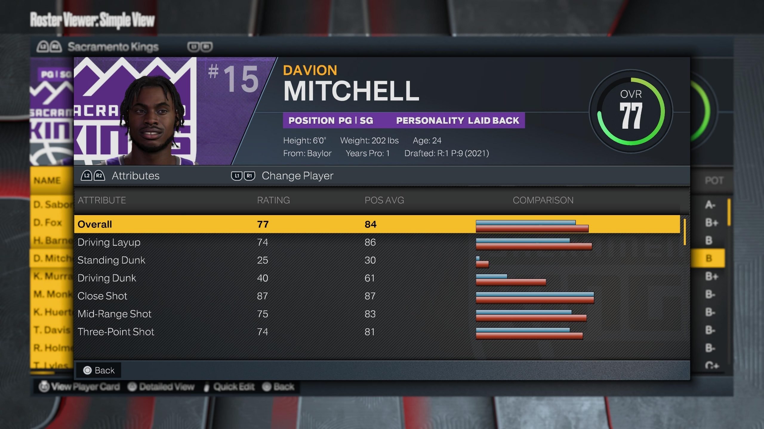 ミッチェルは、87 のクローズ ショット、立派な 75 のミッドレンジ ショット、74 のスリーポイント ショットを備えています。 彼の 86 のボール ハンドルと 82 のスピード ウィズ ボールは、相手を圧倒し、82 のパス精度とパス IQ を使用できるスペースを作るのに役立ちます。 ミッチェルはまた、タイリース・ハリバートンの離脱により、ディアロン・フォックスの先発に続いて滑り込むことで、より多くの時間を過ごすはずです。