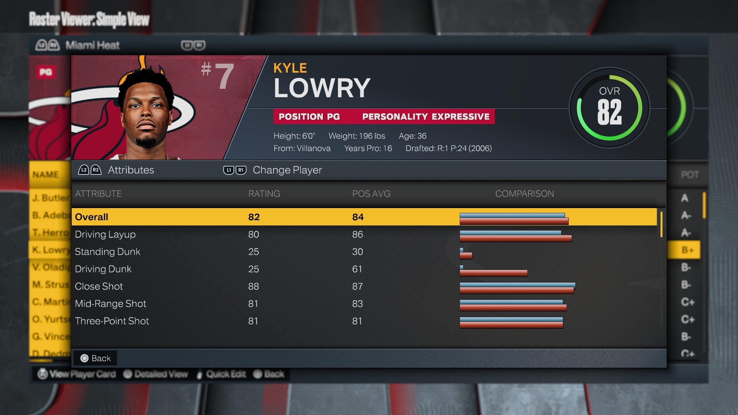 ラウリーは、88 のクローズ ショット、81 のミッドレンジ ショット、81 のスリーポイント ショット、80 のドライビング レイアップなど、優れたシュート統計を持っています。 36 歳の彼は、パス精度 80 とパス IQ 80 のパスにも目を光らせています。 彼の最強の防御統計は 86 境界防御であり、敵が 3 点を降らせるのを止めるのに頼ることができます。