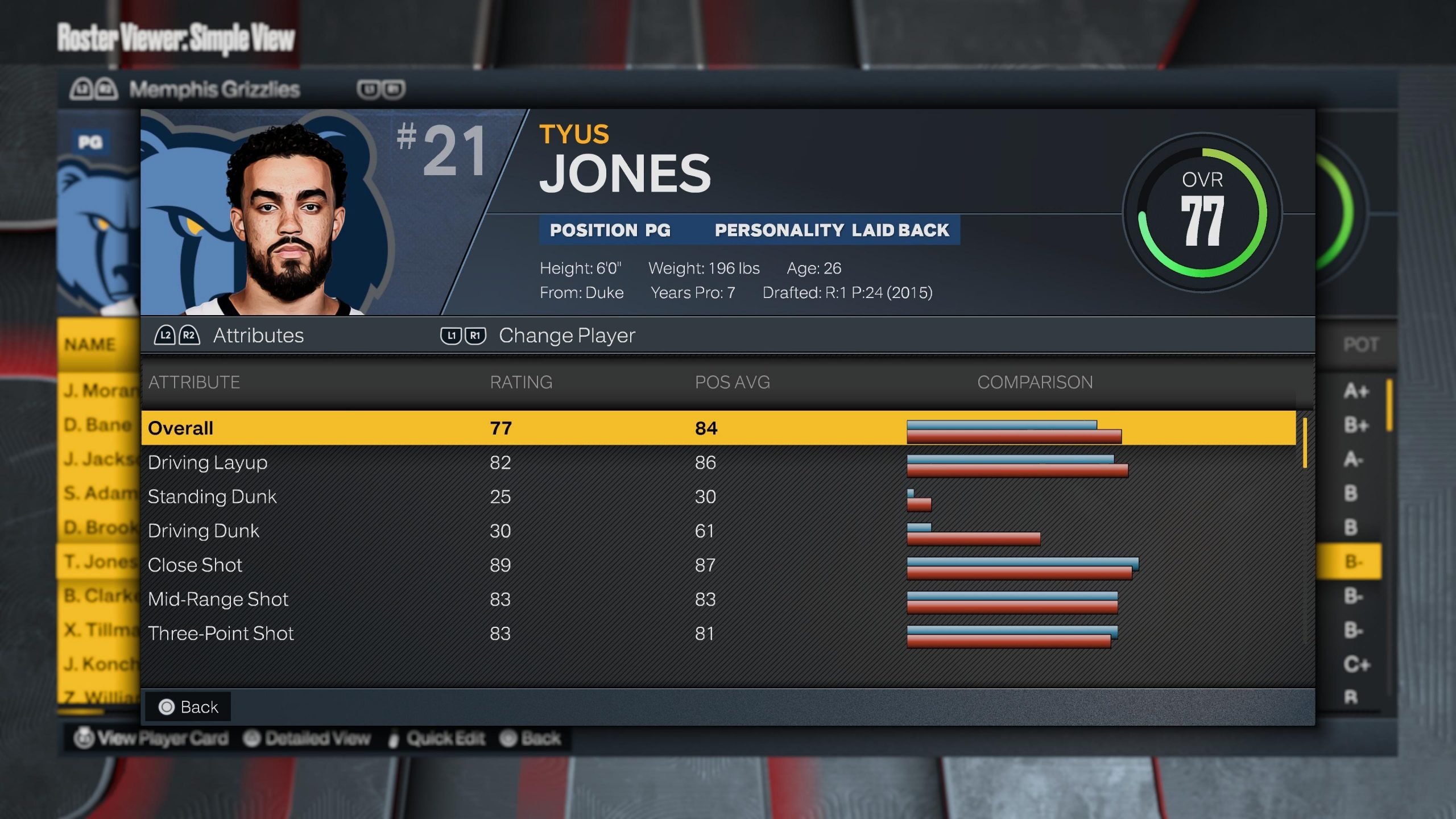 ジョーンズは、89 のクローズ ショット、83 のミッドレンジ ショット、83 のスリーポイント ショット、および 82 のドライビング レイアップを備えた素晴らしい攻撃的な数字を持っており、あらゆる角度からの攻撃の脅威となっています。 ジョーンズのその他の強みには、97 のショット IQ と 82 のボール ハンドリングが含まれます。