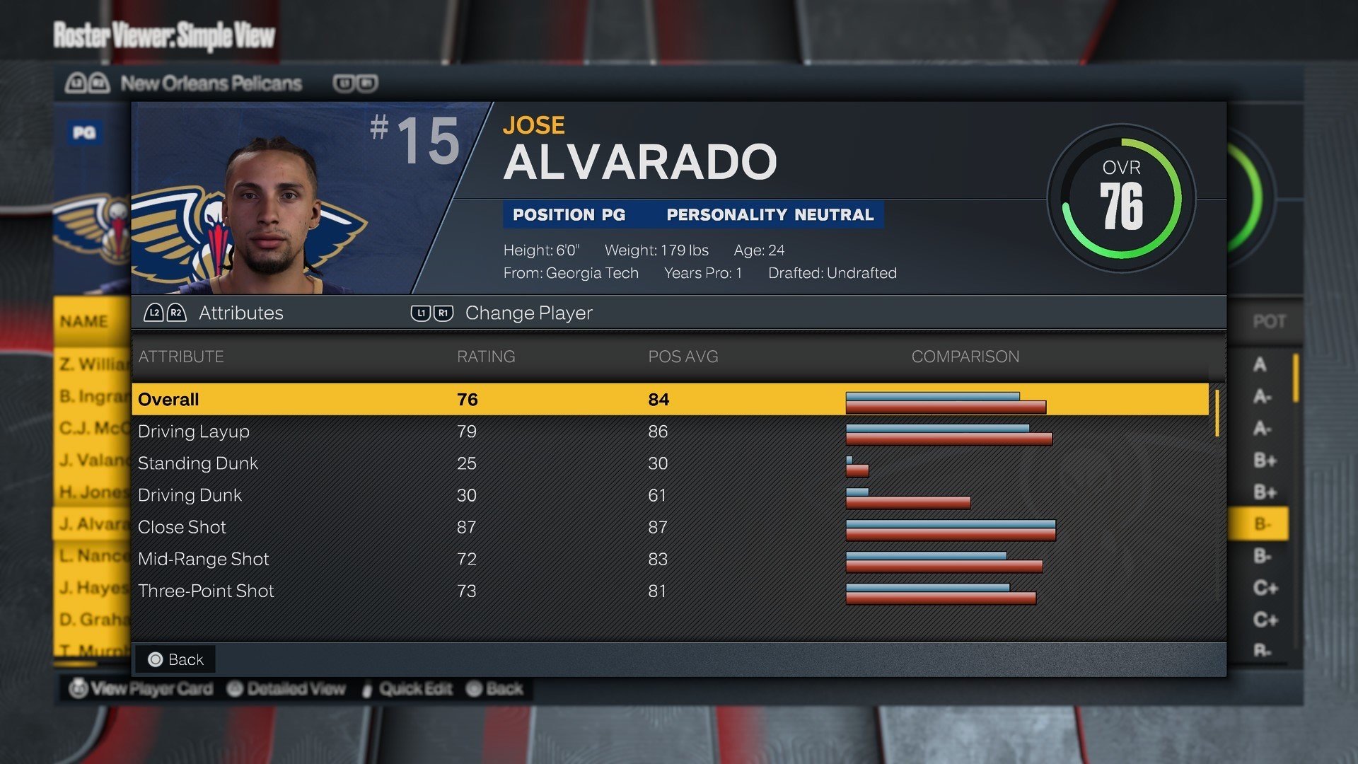 Alvarado にはいくつかの質の高いスタッツがあり、特に彼の 98 スティールは、ポゼッションを取り戻し、パスレーンで対戦相手を二度考えさせるのに役立ちます。 彼は、ポイント ガードのポジションでトップ ディフェンダーの 1 人として広く認められています。 彼のオフェンシブ統計はまともで、87 クローズ ショットと 79 ドライビング レイアップだけでなく、妥当な 72 ミッドレンジ ショットと 73 スリーポイント ショットもあります。