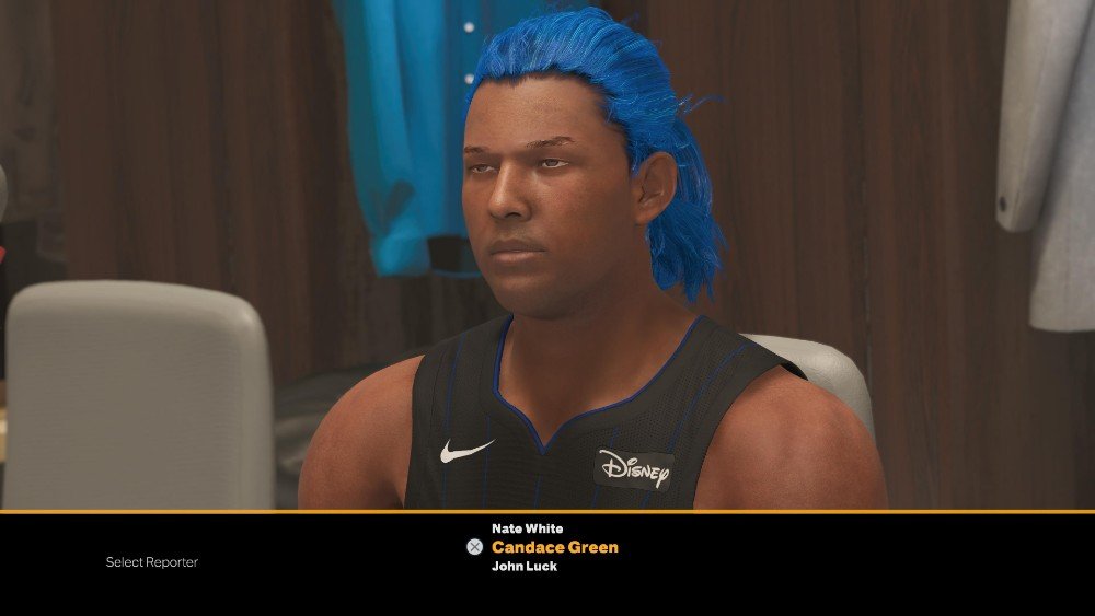 キャンディス・グリーンは、ラックとダンカンの中間です。 彼女の質問は、バスケットボールの内外、X と O の領域にとどまる傾向があります。 Green はまた、スタイル (「全員のフィット感を評価していました」) に対する反応 (「ドロップする最新のトラックについて話し合っていました」) を引き起こす爆発の後に質問をすることもあります。 彼女はスクラムやプレッサーのレポーターとしてすぐに利用できるわけではありませんが、シーズンのいくつかのゲームで、質問のために彼女を選択できるようになります. 彼女の質問はよりオープンエンドになる傾向があるため、プレイヤーからの長い応答に備えてください (X または A を長押しするとスキップできます)。