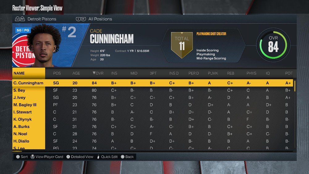 並ぶ: Jaden Ivey、Cade Cunningham (84 OVR)、Saddiq Bey (80 OVR)、Marvin Bagley III (76 OVR)、Isaiah Stewart (76 OVR)